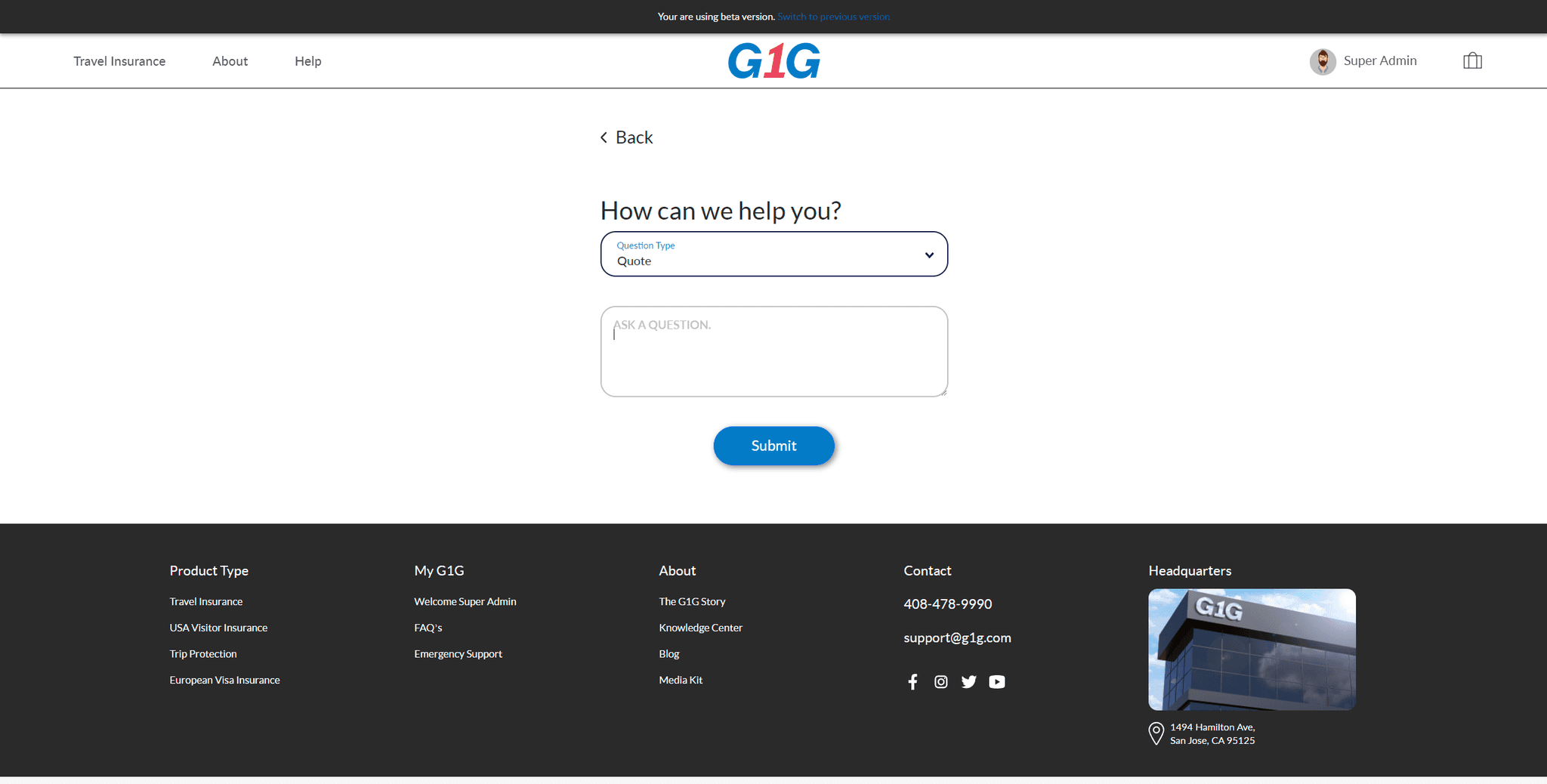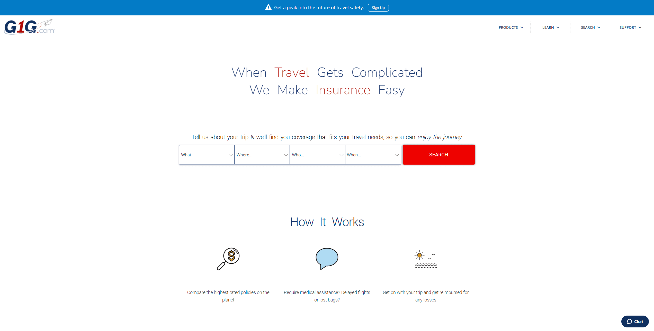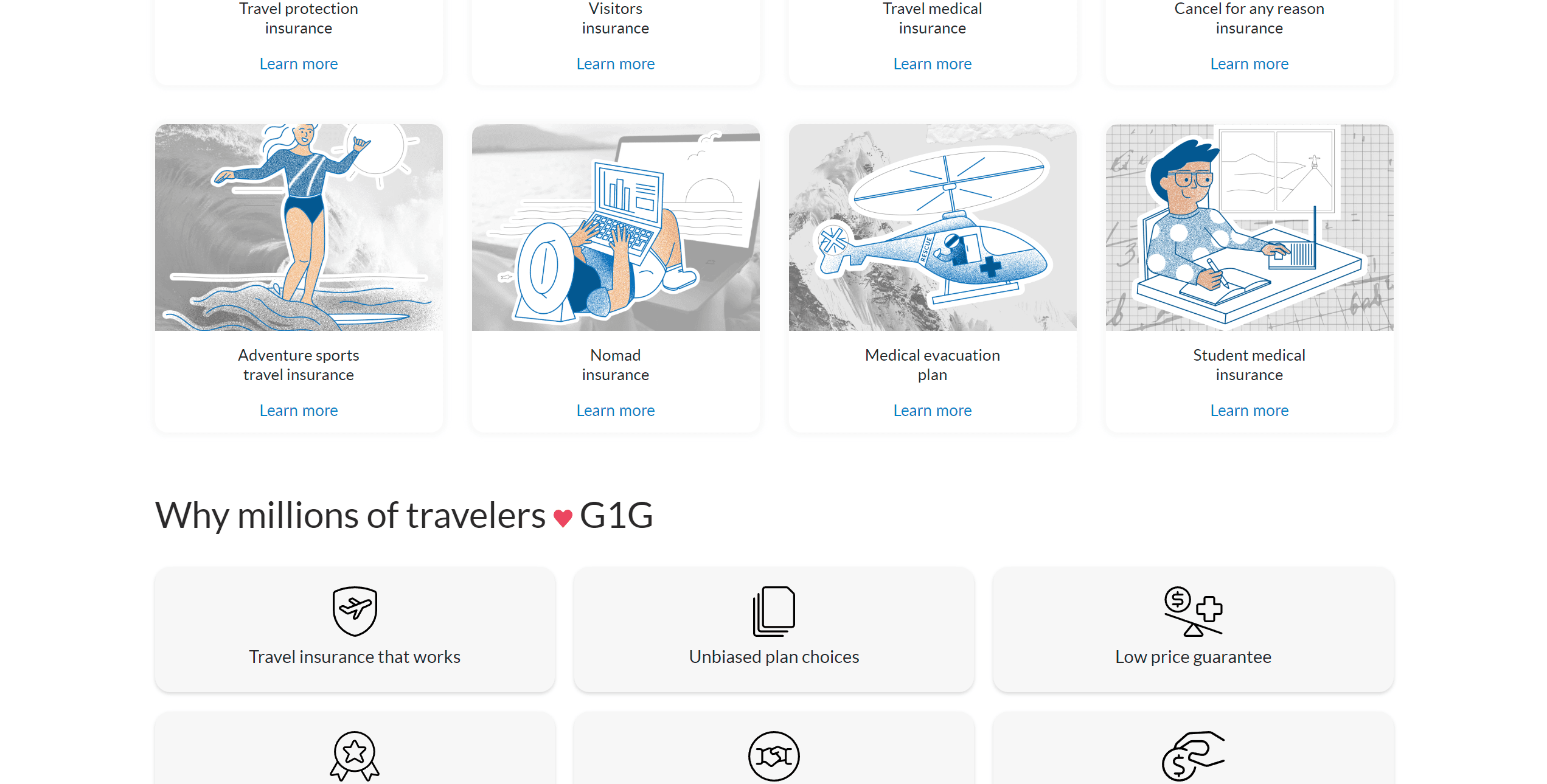 G1G is your trusted one stop shop for all your travel insurance needs. Whether that means picking the right plan, finding the best hospital or doctor in your area, or helping you file a claim, we are there for you every step of the way so you may travel worry free.